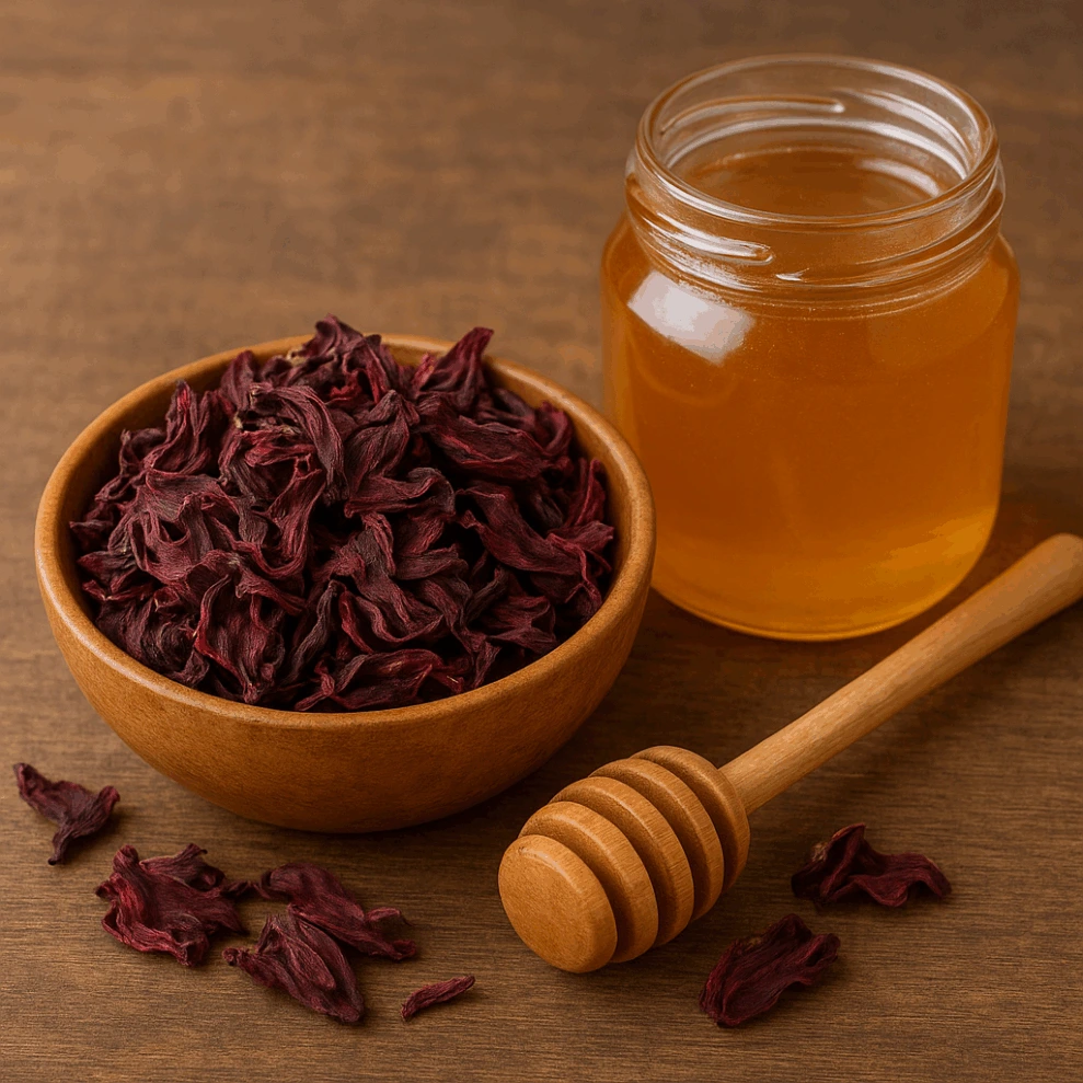 Fleurs séchées d’hibiscus (bissap), infusion rafraîchissante et riche en antioxydants.
